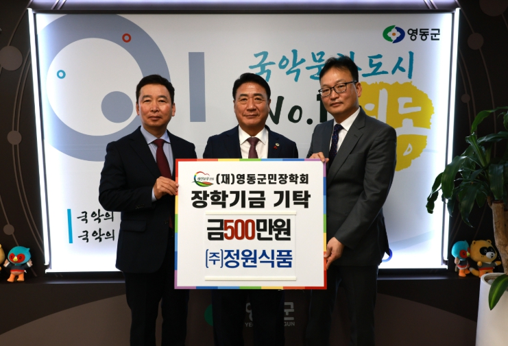 [뉴스다컴] ㈜정원식품(대표 김훈섭)은 16일 오후 영동군청을 방문해 지역 미래 인재를 육성하기 위한 장학금 500만 원을 (재)영동군민장학회에 기탁했다.
