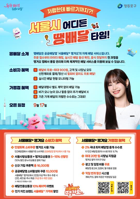 [뉴스다컴] 영등포구가 높은 수수료와 배달료로 어려움을 겪는 소상공인과 소비자의 비용 부담을 줄이기 위해 9월 17일부터 구 전역에서 ‘땡배달’ 서비스를 본격 운영하고 있다고 밝혔다.