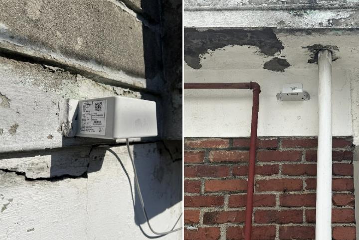 | ▲ 노후 담장과 주택에 계측기를 부착해 모니터링하고 있다 |