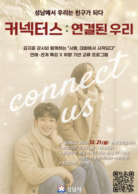 [뉴스다컴] 성남시는 새로운 친구를 만들 수 있는 청년 교류 행사 ‘커넥터스(Connect-us) 연결된 우리’ 참가 희망자 300명을 오는 12월 5일까지 모집한다.