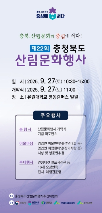 [뉴스다컴] 제22회 충청북도 산림문화행사가 오는 27일 오전 10시 30분부터 영동군 유원대학교 영동캠퍼스 일원(영동읍 대학로 310)에서 열린다.