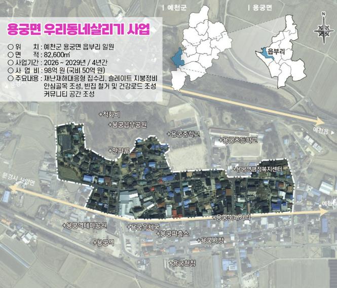 사업 대상지는 예천군 서부 관문 역할을 하는 용궁면 읍부리 일원으로, 노후 건축물 비율이 높고, 슬레이트 지붕 주택과 빈집이 다수 분포해 주거환경 개선이 시급한 지역이다.