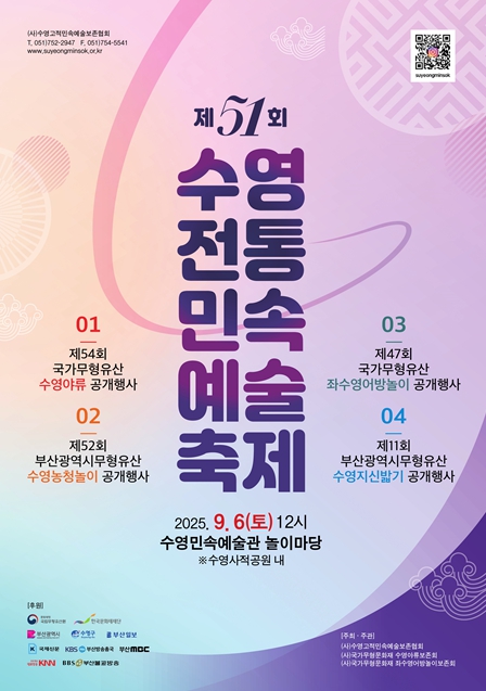 [뉴스다컴] 부산시는 내일(6일) 정오에 시 무형유산 전수교육관인 '수영민속예술관 놀이마당'에서 무형유산의 보존과 원형 전승을 위해 '2025 제51회 수영전통민속예술제'를 개최한다고 밝혔다.
