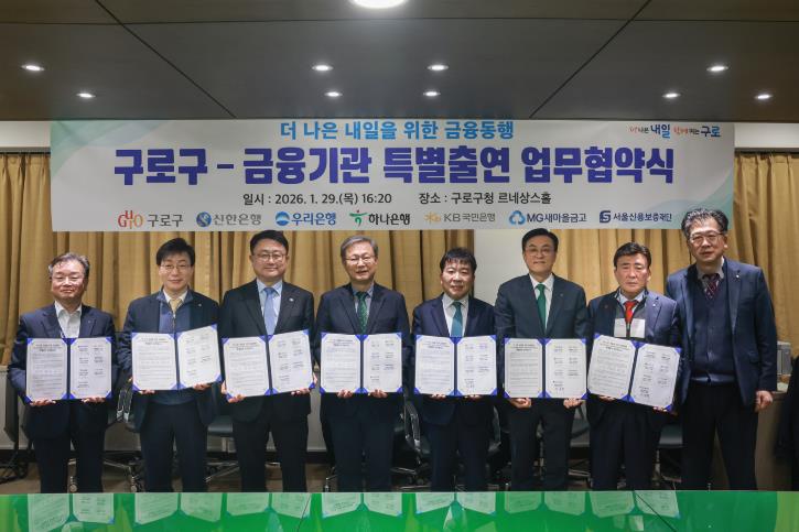 [뉴스다컴] 구로구가 1월 29일 구청 3층 르네상스홀에서 신한은행, 우리은행, 하나은행, 국민은행, 새마을금고, 서울신용보증재단과 ‘더 나은 내일을 위한 금융동행’ 특별출연 협약을 체결하고, 총 212억 5천만 원 규모의 중소기업·소상공인 특례보증을 추진한다.