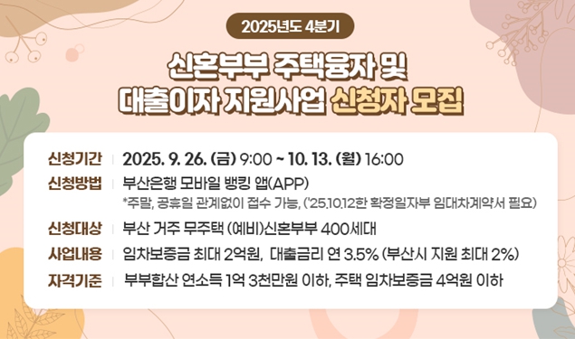 [뉴스다컴] 부산시는 올해 4분기 '신혼부부 주택융자 및 대출이자 지원사업'의 지원 대상자를 내일(26일)부터 10월 13일까지 모집한다고 밝혔다.