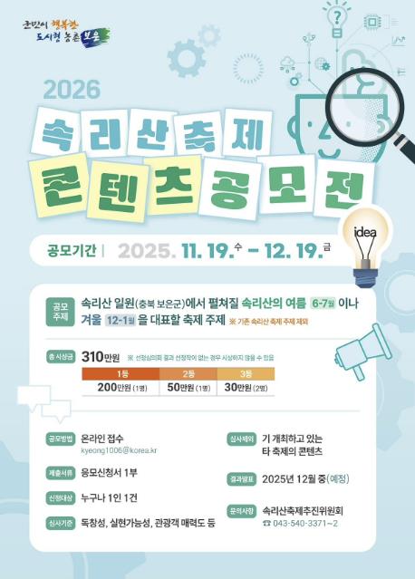 이혜영 문화관광과장은 “축제의 변화를 위해 현대적인 축제 콘텐츠로 재해석하는 데에는 전국을 무대로 한 아이디어 수집이 필요하다”며 “여름·겨울 비수기에 속리산을 다시 찾게 만들 콘텐츠를 기다린다”고 밝혔다.
