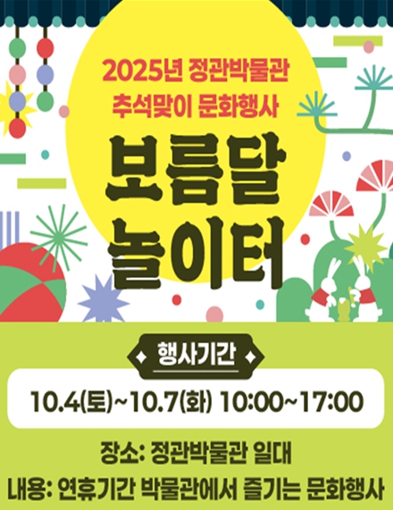[뉴스다컴] 정관박물관은 다가오는 추석을 맞아 특별 문화행사 '보름달 놀이터'를 오는 10월 4일부터 10월 7일까지 개최한다고 밝혔다.
