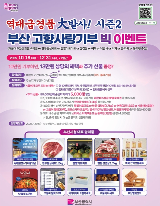 [뉴스다컴] 부산시는 지난 10월 16일부터 진행 중인 '역대급 경품 대발사 시즌2! 부산 고향사랑기부제 연말 빅 이벤트'에 많은 동참을 당부했다.
