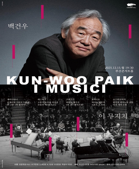 [뉴스다컴] 클래식부산은 오는 12월 15일 오후 7시 30분 부산콘서트홀에서 세계적인 피아니스트 '백건우'와 이탈리아 명문 현악합주단 '이 무지치(I Musici)'가 부산에서 첫 협연 무대 '백건우 앤드(·) 이 무지치'를 선보인다고 밝혔다.