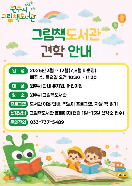 [뉴스다컴] 원주시 그림책도서관은 오는 3월부터 12월까지 관내 유치원과 어린이집을 대상으로 어린이 견학 프로그램을 운영한다.