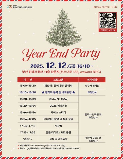 시는 오늘(12일) 오후 4시 부산국제금융센터(BIFC)에서 입주기업 및 협력기관과 함께 한해 성과를 확산하고 산·관 협력체계를 강화하기 위해 '2025 부산 핀테크 허브 성과공유회'를 개최한다.