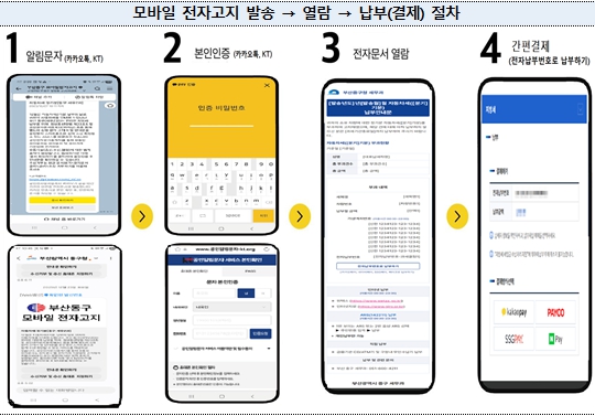 [뉴스다컴] 부산시는 기존 우편(종이) 송달하고 있는 지방세 관련 각종 고지·안내문을 전자문서 형태로 공인전자문서중계자(카카오, KT, SKT, LGU+) 문자 메시지로 전송하는 '모바일 전자고지 서비스'를 2월부터 본격 시행한다고 밝혔다.