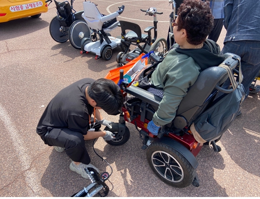 | ▲ 장애인보조기기 수리지원(전동휠체어 타이어 교체) 작업 장면 |