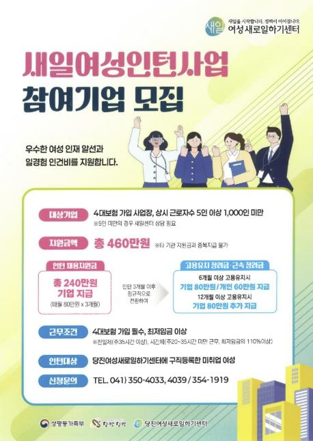 모집 대상은 참여업체와 인턴으로, 참여업체는 4대보험 가입 기업체이자 상시근로자 수 5인 이상 1,000인 미만이어야 한다. 인턴은 새일센터에 구직 등록한 미취업 여성이면 누구나 지원할 수 있으며 당진새일센터는 올해 62명을 모집할 계획이다.