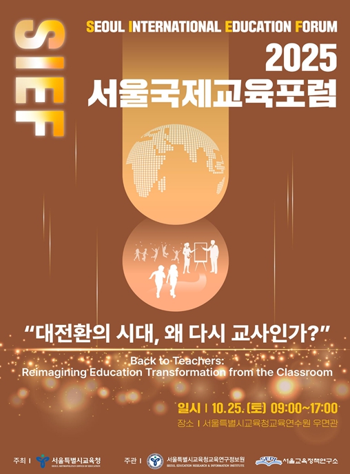 [뉴스다컴] 서울특별시교육청 산하 서울특별시교육청교육연구정보원 교육정책연구소는 오는 10월 25일 서울특별시교육청교육연수원에서 “대전환의 시대, 왜 다시 교사인가(Back to Teachers: Reimagining Education Transformation from the Classroom)”를 주제로 2025 서울국제교육포럼(Seoul International Education Forum, 이하 SIEF 2025)을 개최한다.