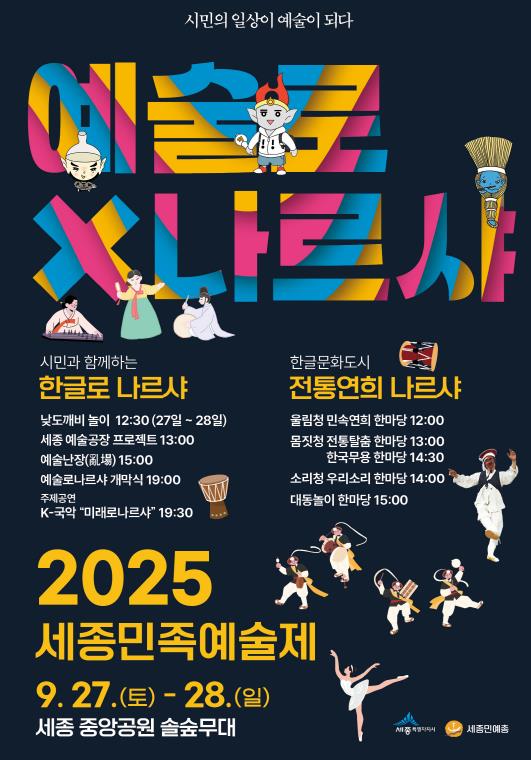 [뉴스다컴] 세종특별자치시가 주최하고 한국민족예술단체총연합회 세종지회가 주관하는 2025 세종민족예술제 ‘예술로 나르샤’가 오는 27∼28일 이틀간 세종중앙공원 솔숲 무대에서 펼쳐진다.