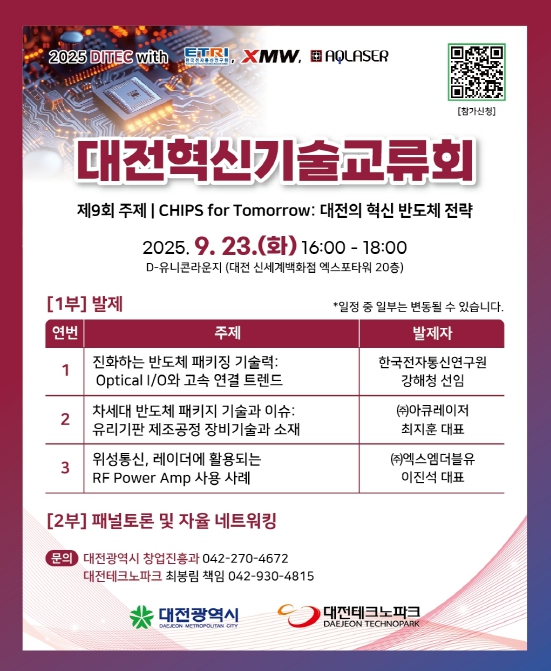 이번 교류회는 ‘CHIPS for Tomorrow: 대전의 혁신 반도체 전략’을 주제로, 한국전자통신연구원(ETRI)과 반도체 산업 분야 기업들이 함께 모여 대전의 6대 전략산업 중 하나인 반도체 산업의 발전 방향을 논의한다.