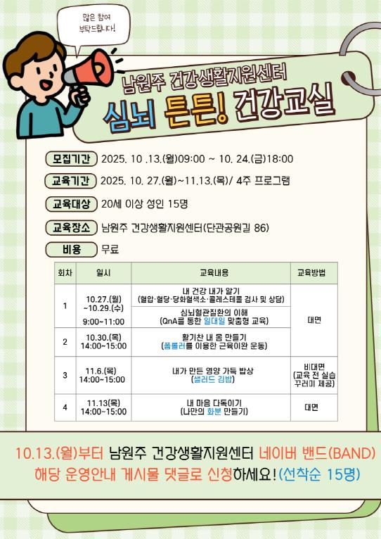 [뉴스다컴] 남원주건강생활지원센터는 심뇌혈관질환의 이해·예방과 건강관리를 돕기 위해 10월 27일부터 11월 13일까지 ‘심뇌 튼튼! 건강교실’을 운영한다.