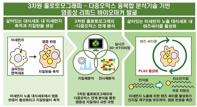 4일 전남대에 따르면 이번 연구는 3차원 홀로토모그래피(3D-holotomography)와 다중오믹스(multi-omics) 분석 기술을 통합해, 살아 있는 대식세포(macrophage) 내부에서 미세먼지 노출로 인한 대사 변화를 실시간으로 관찰한최초 사례로 평가된다.