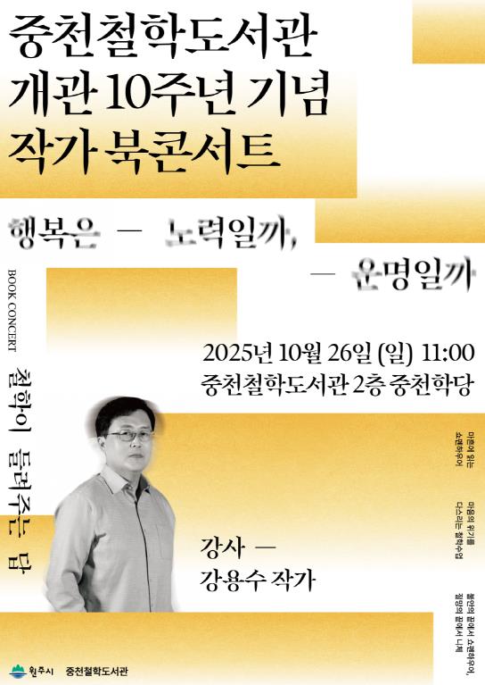 [뉴스다컴] 원주시 중천철학도서관은 오는 26일 오전 11시, 개관 10주년 기념 작가 북콘서트를 개최한다.