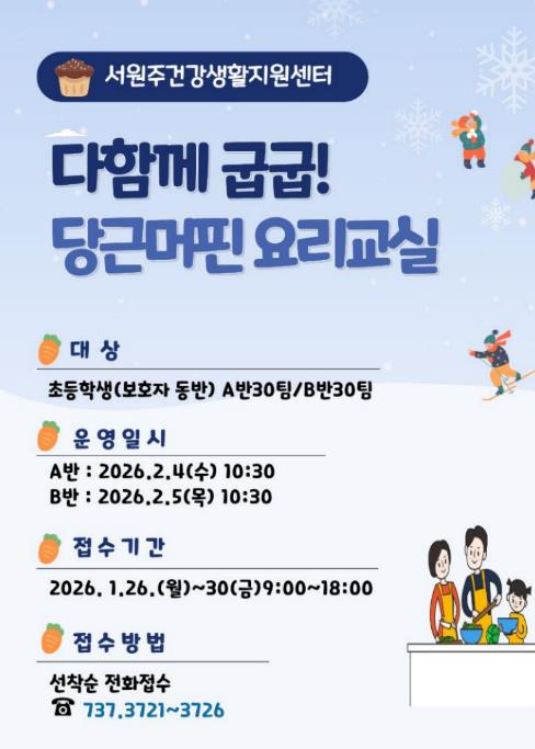 [뉴스다컴] 서원주건강생활지원센터는 겨울방학 중 아이들의 올바른 식습관 형성을 돕기 위해 ‘다함께 굽굽! 당근머핀 요리교실’ 프로그램을 운영한다.