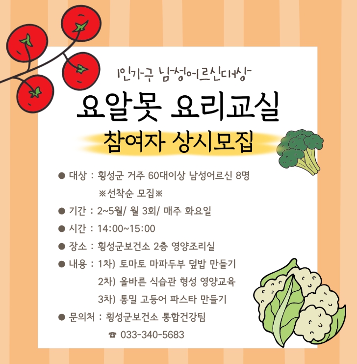 [뉴스다컴] 횡성군은 1인가구 남성 어르신의 건강한 식생활 형성과 영양관리 강화를 위해 2월부터 5월까지 “요알못(요리를 알지 못하는) 영양교실”을 운영한다.