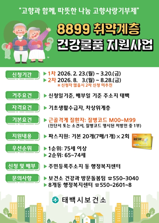 [뉴스다컴] 태백시는 고향사랑기금을 활용해 관절염 등 근골격계 질환으로 어려움을 겪는 관내 취약계층 어르신을 대상으로 『8899 취약계층 건강물품 지원사업』을 추진한다고 밝혔다.
