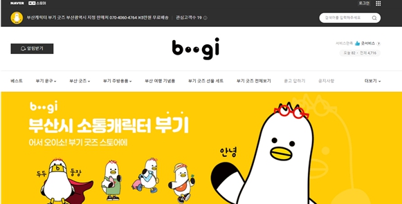 [뉴스다컴] 부산시는 부산시 소통 캐릭터 '부기' 상품을 한곳에서 구매할 수 있는 네이버 스마트스토어 '부기타운'을 운영한다고 밝혔다.