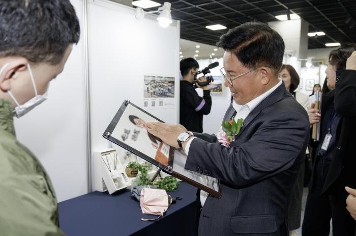 | ▲ 박강수 마포구청장이 장애인 예술인이 만든 작품을 감상하고 있다. |