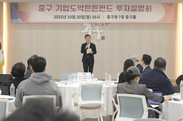 [뉴스다컴] 서울 중구가 지난 20일 중구청에서 '중구 기업도약든든펀드 투자설명회'를 열고, 성장 잠재력이 높은 중소·벤처기업을 대상으로 투자 유치와 성장 지원 계획을 밝혔다.