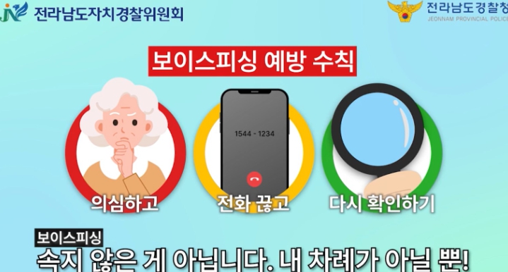 이에 전남자치경찰위원회는 젊은 세대부터 고령층까지 누구나 쉽게 이해할 수 있도록 짧고 직관적인 숏폼 형식의 보이스피싱 예방 영상을 제작해 배포하고, 전남자치경찰위원회 누리집을 통해 누구나 다운받아 활용할 수 있도록 했다.