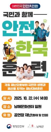 [뉴스다컴] 남해군은 각 기관의 협업체계와 현장 대응능력을 점검하기 위해 오는 10월 22일 남해문화센터 일원에서 ‘2025년 재난대응 안전한국훈련’을 실시한다고 밝혔다.