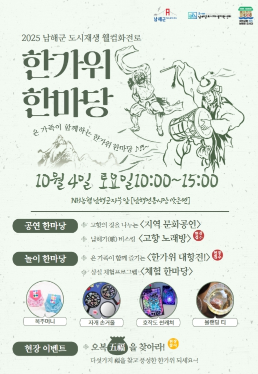 [뉴스다컴] 남해군도시재생지원센터는 추석연휴를 맞아 오는 10월 4일 NH농협 남해군지부 앞(전통시장 맞은편)에서 ‘한가위 한마당’ 행사를 개최한다고 밝혔다.