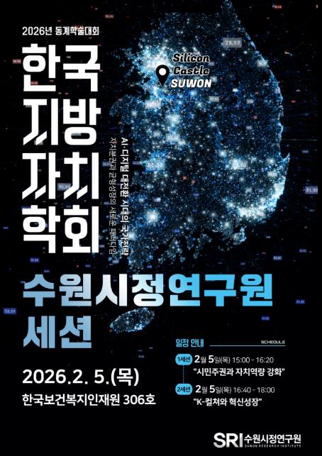 [뉴스다컴] 수원시정연구원은 오는 2월 5일(목) 충북 청주 오송 한국보건복지인재원에서 열리는 2026년 한국지방자치학회 동계학술대회에서 수원시의 대표 혁신 정책과 미래 성장 전략을 주제로 한 세션을 개최한다고 2월 2일 밝혔다.