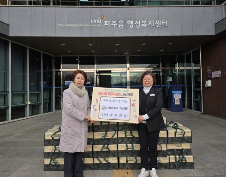 [뉴스다컴] 파주시 파주읍은 지난 26일 영진건설㈜이 파주읍 행정복지센터를 방문해 지역 내 어려운 이웃들에게 따뜻한 사랑을 나누고자 떡 선물 꾸러미 40상자(200만 원 상당)를 기탁했다고 전했다.