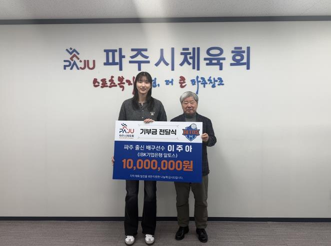 이주아 선수는 “고향 파주에서 많은 응원과 도움을 받으며 운동을 시작했고, 덕분에 지금의 자리까지 올 수 있었다”라며, “지역 체육 발전과 후배 선수들에게 작게나마 힘이 되고자 기부를 결심하게 됐다”라고 소감을 밝혔다. 이어 “앞으로도 파주 체육이 더욱 활성화돼 꿈을 키우는 후배들이 더 나은 환경에서 운동할 수 있기를 바란다”라고 덧붙였다.