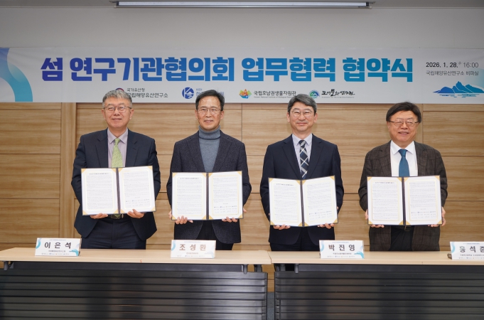 [뉴스다컴] 기후에너지환경부 산하 국립호남권생물자원관(관장 박진영)은 국립해양유산연구소, 한국섬진흥원, 국립목포대학교 도서문화연구원과 함께 2026년 1월 28일 국립해양유산연구소(전남 목포시 소재)에서 '섬 연구기관 협의회' 출범을 위한 업무협약을 체결했다.
