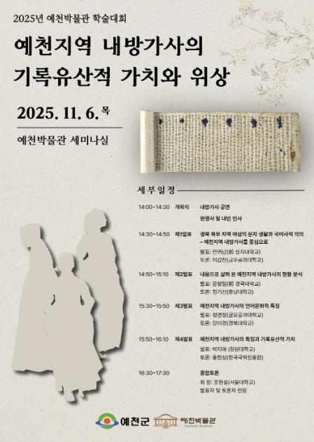 [뉴스다컴] 예천군 예천박물관은 11월 6일 오후 2시 ‘예천지역 내방가사의 기록유산적 가치와 위상’이란 주제로 학술대회를 개최한다.