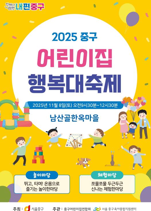 [뉴스다컴] 서울 중구는 오는 11월 8일 토요일 오전 9시 30분부터 12시 30분까지 남산골 한옥마을 천우각 광장 일대에서 '2025 중구어린이집 행복대축제'가 개최된다고 밝혔다.