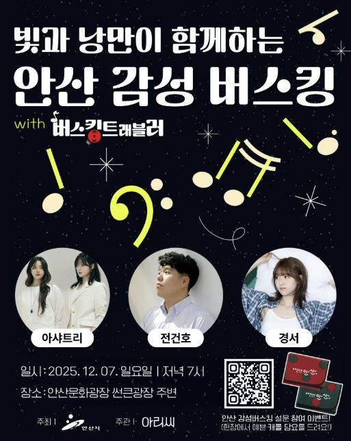 특히 버스킹 공연은 ‘안산 겨울 빛의 나라’ 축제를 배경으로 진행돼 감미로운 공연과 함께 화려한 조명으로 가득찬 문화광장의 아름다운 풍경을 즐길 수 있다.