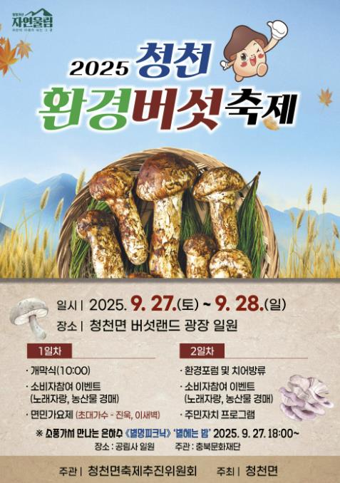 [뉴스다컴] 충북 괴산군 청천면의 대표 지역축제인 ‘2025 청천환경버섯축제’가 오는 27일부터 28일까지 이틀간 청천 버섯랜드 광장 일원에서 열린다.