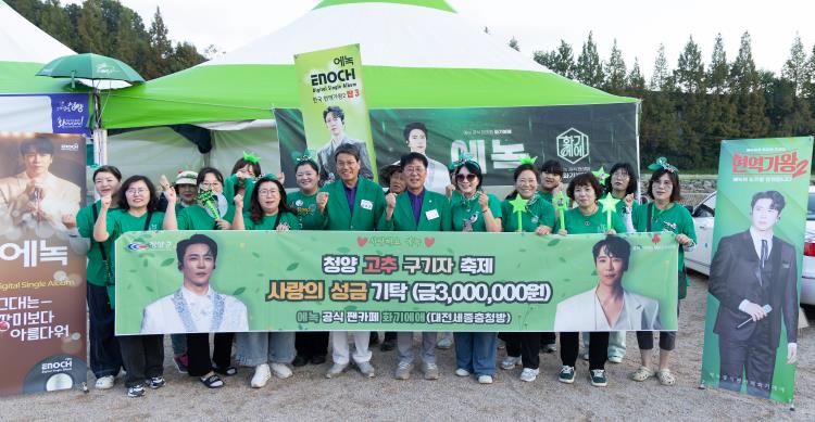 [뉴스다컴] 청양군은 청양고추구기자축제 축하공연에 맞춰 뮤지컬 배우 겸 트로트 가수 에녹의 공식 팬카페 ‘화기에애(대전·세종·충청방)’가 관내 저소득 가구 지원을 위해 성금 300만 원을 기탁했다고 밝혔다.