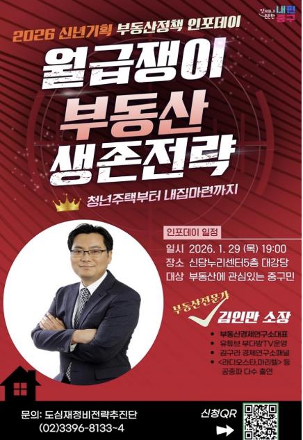 [뉴스다컴] 서울 중구가 급변하는 부동산 환경 속에서 주민들의 현실적인 대응 전략을 돕기 위해 오는 29일 저녁 7시 신당누리센터 5층 대강당에서 올해 첫 도시런(learn) 스쿨‘신년기획 부동산 전략 인포(INFO)데이’를 연다.