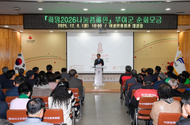 [뉴스다컴] 부여군은 ‘행복을 더하는 기부, 기부로 바꾸는 부여’라는 구호 아래 '희망 2026 나눔 캠페인' 순회 모금 행사를 지난 8일 여성문화회관 3층 대강당에서 개최했다.