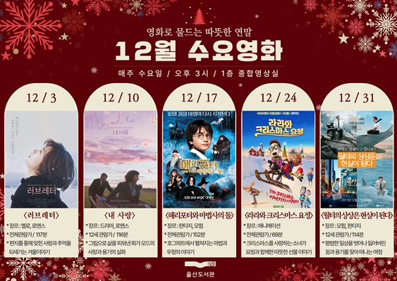 [뉴스다컴] 울산도서관이 12월 한 달 동안 ‘영화로 물드는 따뜻한 연말’을 주제로 매주 수요일 오후 3시 도서관 1층 종합영상실에서 수요영화를 상영한다.