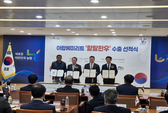 [뉴스다컴] 대한민국 축산물 브랜드경진대회에서 2019년, 2021년, 2023년 대통령상을 수상한 강원특별자치도 통합브랜드 ‘강원한우’가 10월 30일 서울 농협중앙회 본관에서 ‘강원한우 아랍에미리트(UAE) 수출 선적식’을 개최했다.