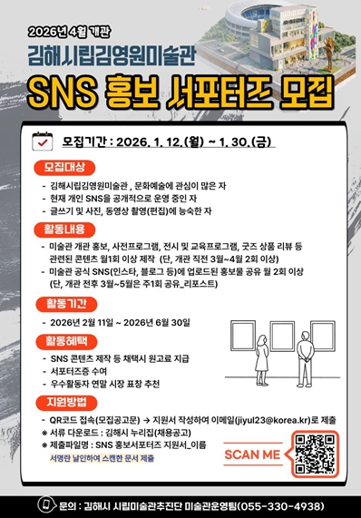 [뉴스다컴] 김해시는 오는 2026년 4월 개관 예정인 ‘김해시립김영원미술관’을 알리고, 미술관의 개관 과정을 생생하게 기록하고 홍보할 'SNS 홍보 서포터즈'를 모집한다고 밝혔다.
