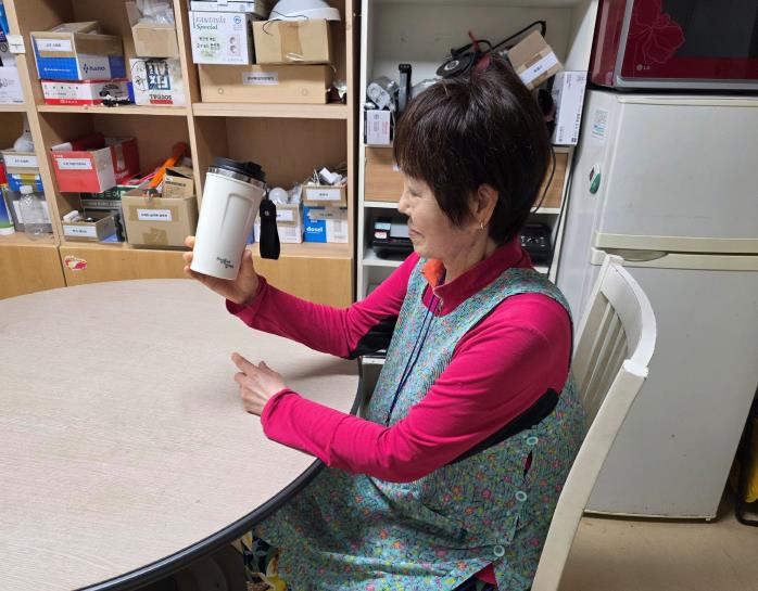 ▲ 성동구는 공동주택 필수노동자 대상 근무환경 개선 물품으로 텀블러를 배부하고 있다 |