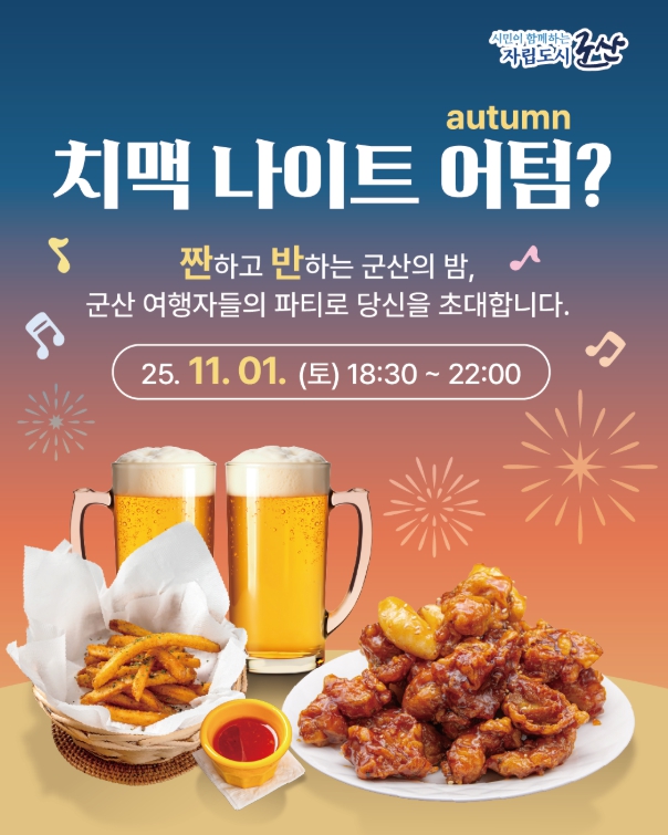 [뉴스다컴] 깊어가는 가을밤, 군산시가 탁 트인 야외에서 즐기는 특별한 행사 ‘치맥나이트 어텀(Autumn)?’을 11월 1일 저녁 군산 내항 일원에서 개최한다.