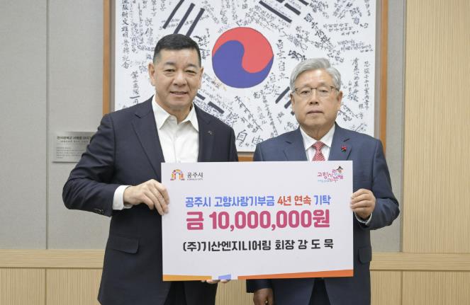 [뉴스다컴] 공주시는 지난 9일 ㈜기산엔지니어링 강도묵 회장이 4년 연속 고향사랑기부제 고액 기부를 이어가며 남다른 고향사랑의 마음을 전하고 있다고 밝혔다.